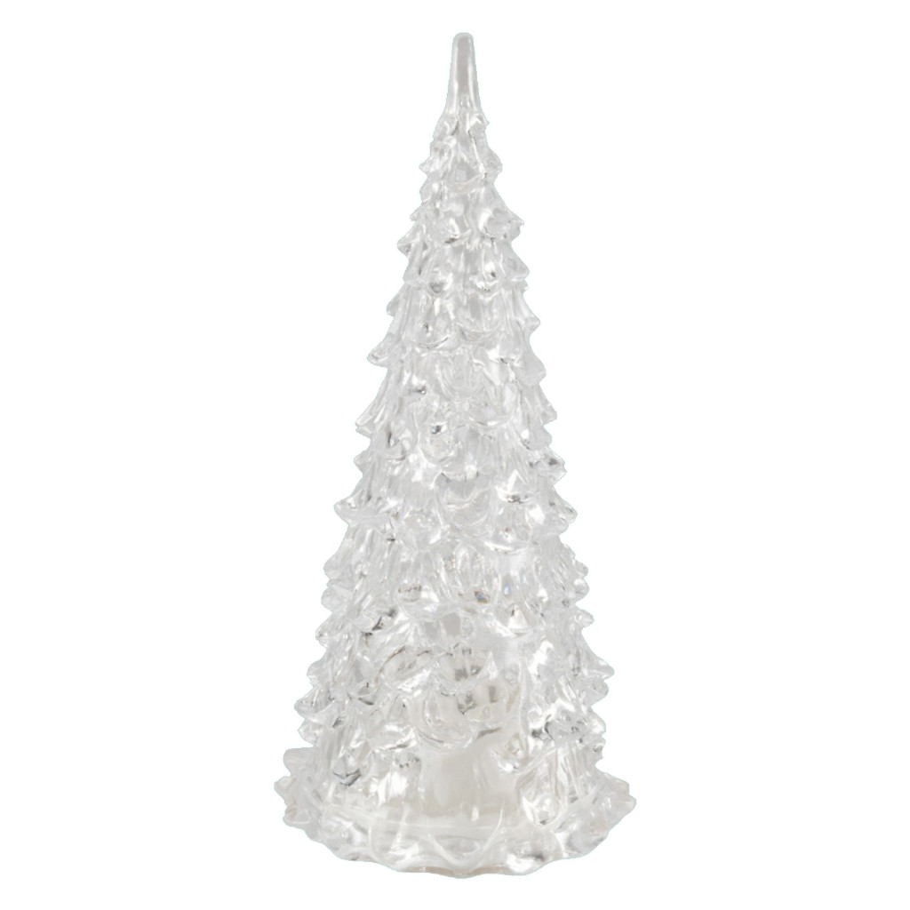 Ez a 12 cm magas, átlátszó, műanyagból készült LED világítással ellátott fenyőfa dekoráció remek választás az ünnepi hangulat fokozásához beltérben. A dekorációban elhelyezett 1 db színváltós LED világítás különleges fényjátékkal borítja be a környezetet, ezzel bármelyik szobát varázslatossá teszi. Kis méretének köszönhetően olyan helyiségekbe is könnyen karácsonyi hangulat csempészhető vele, ahová más, nagyobb dekorációkat helyhiány miatt nem lehet elhelyezni. Ki- és bekapcsolható funkcióval. 2 db LR44 elemmel működtethető, amelyet a termék tartalmaz.