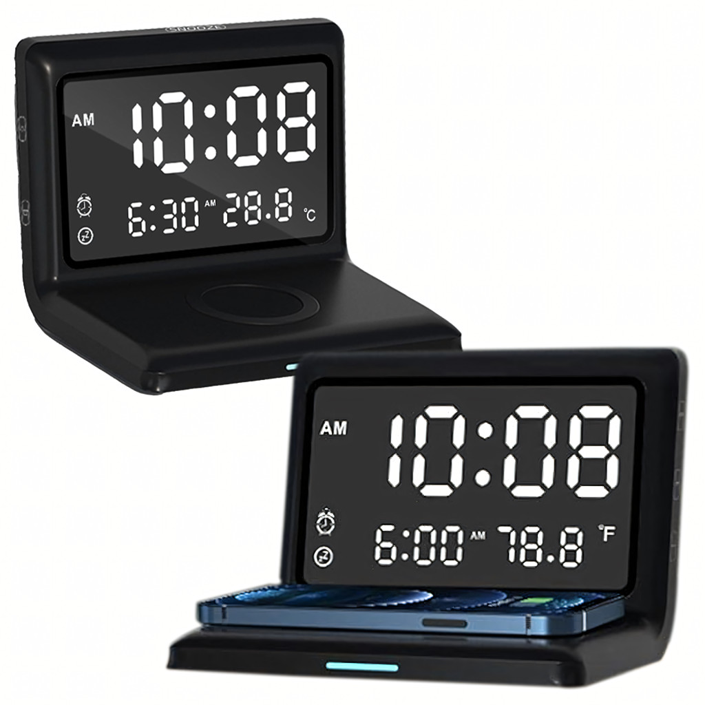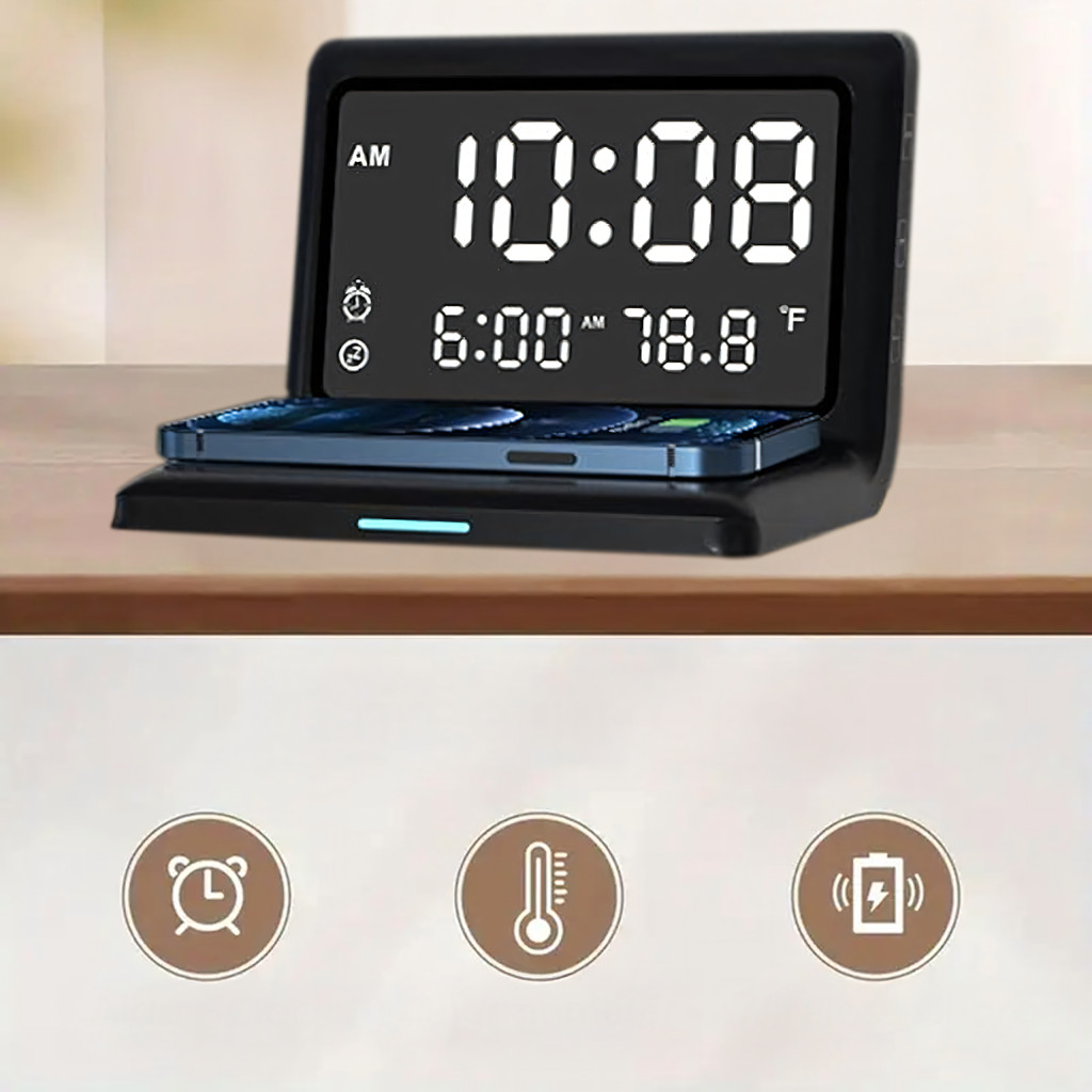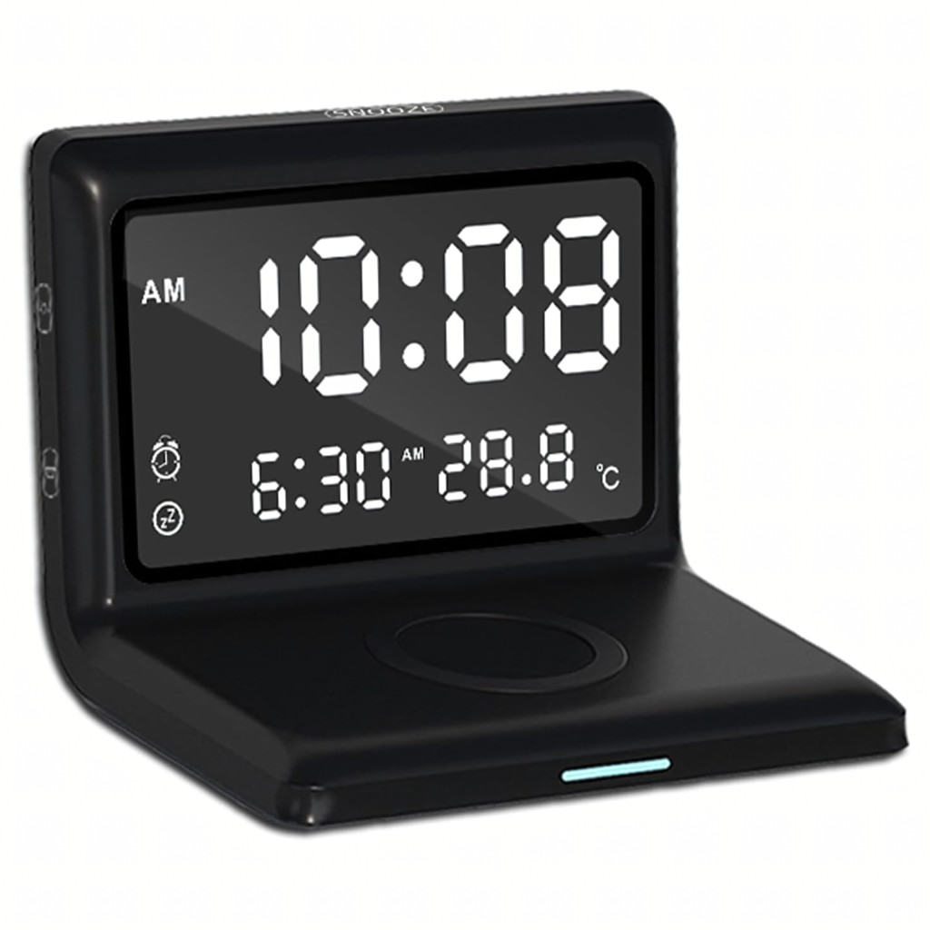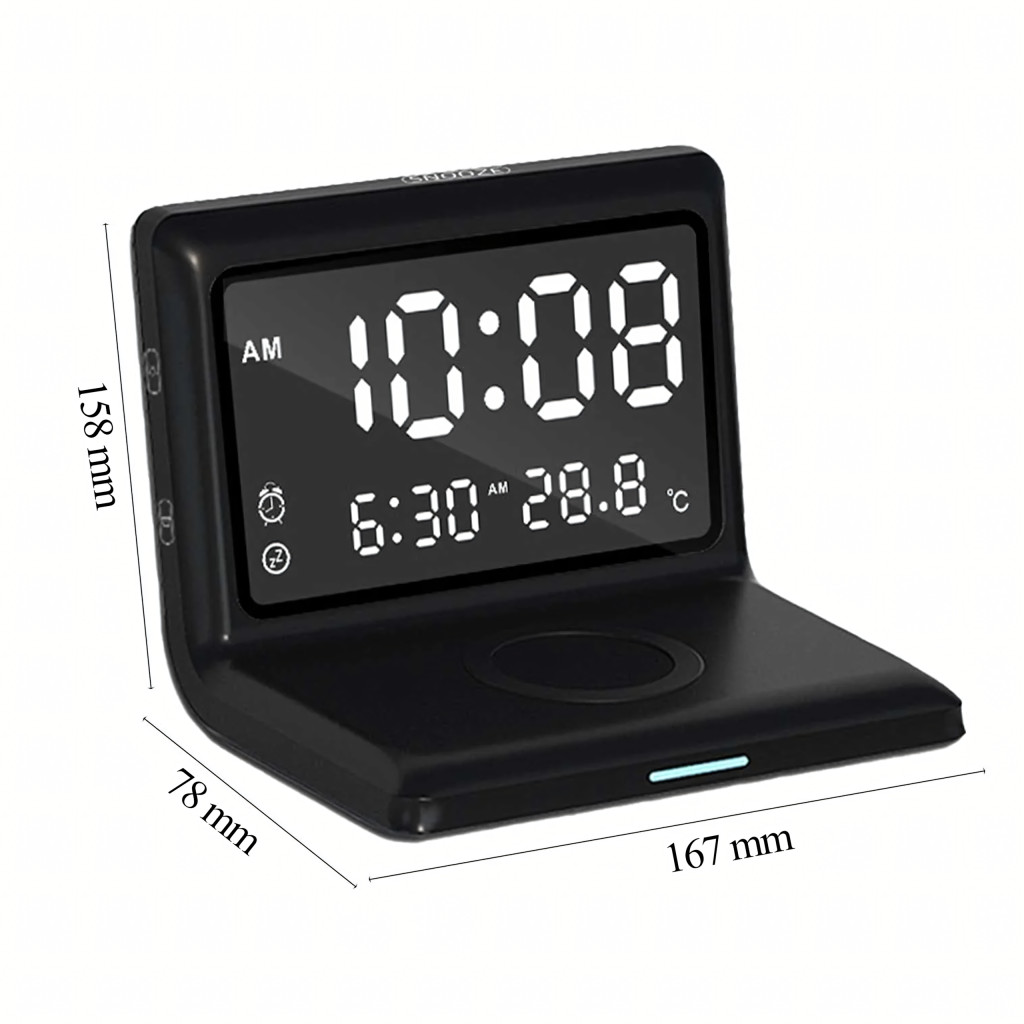 3 az 1-ben digitális ébresztőóra, vezeték nélküli töltő 15 W-os, hőmérővel