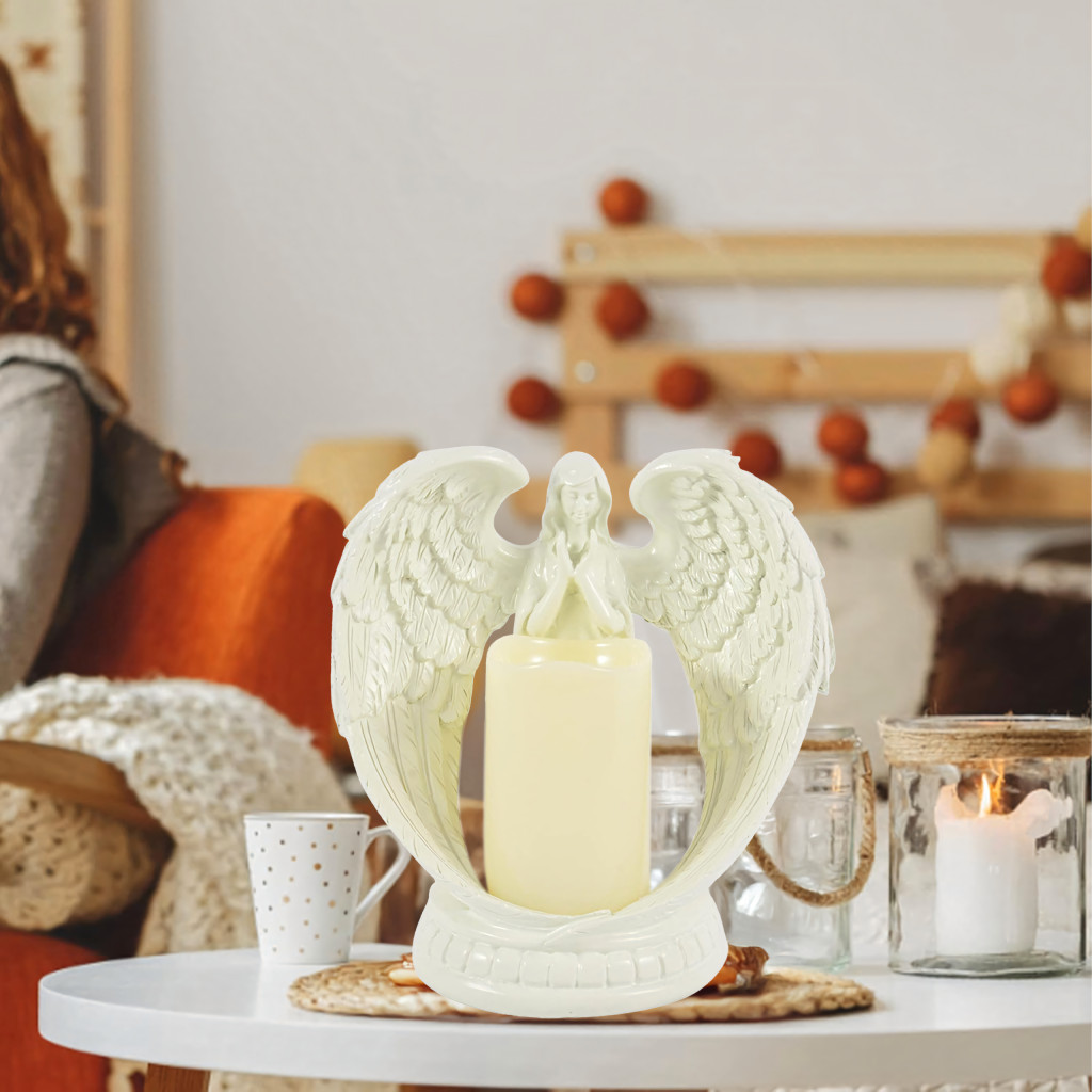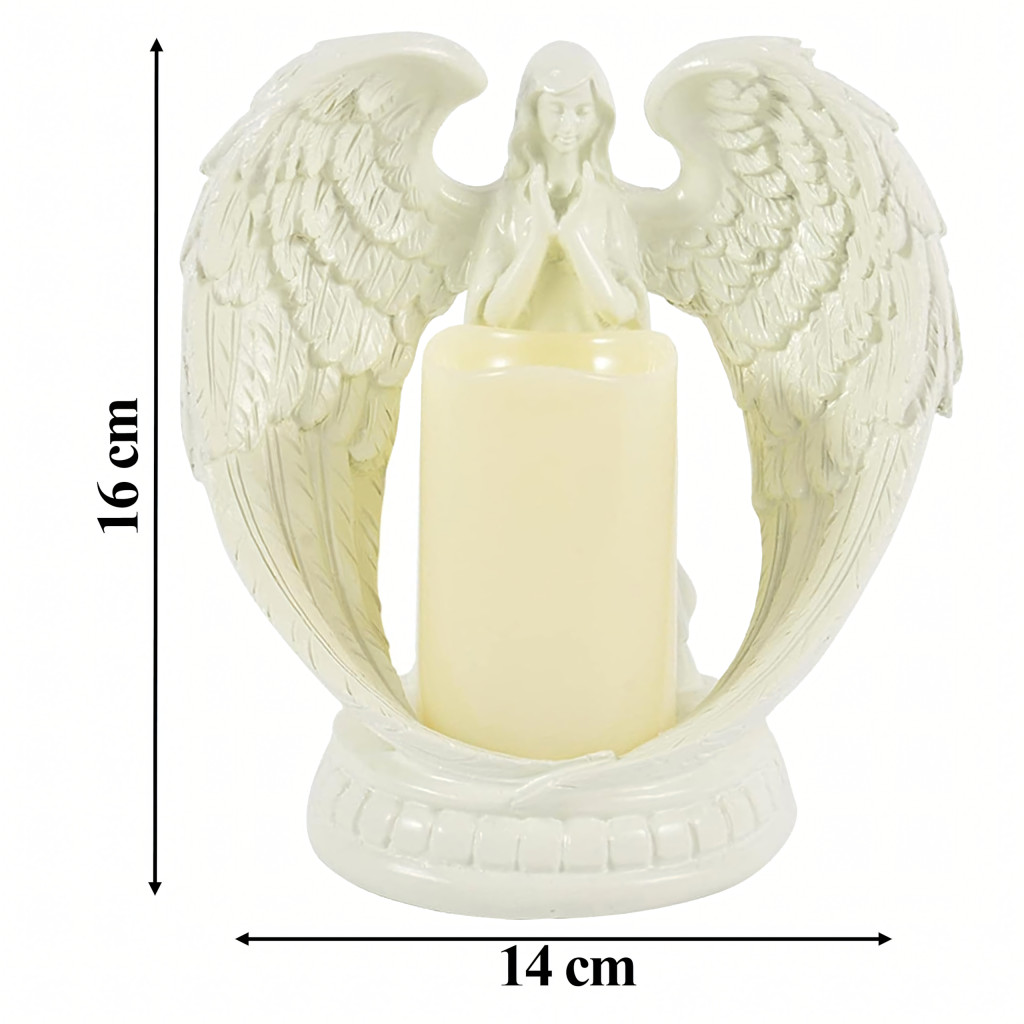 LED-es angyal gyertyával – elegáns gyertyatartó valósághű LED-fénnyel. Gipszből készült , a békét, az emlékezést és az áldást szimbolizálja . Tökéletes lakberendezési tárgyként, vallási ünnepségekre, sírra vagy egyedi ajándékként .