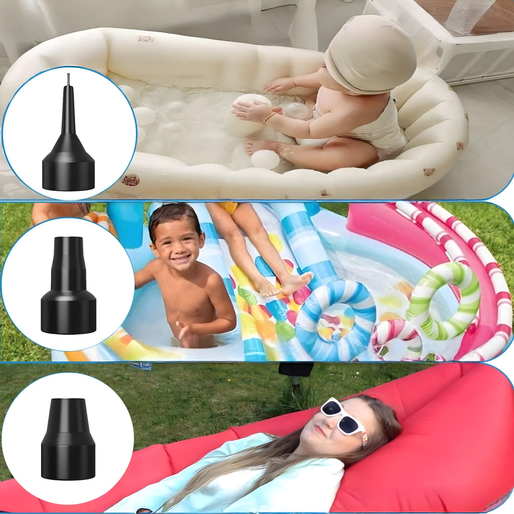 3 univerzális vég mellékelve – különféle szelepekhez és felfújható termékekhez alkalmas.