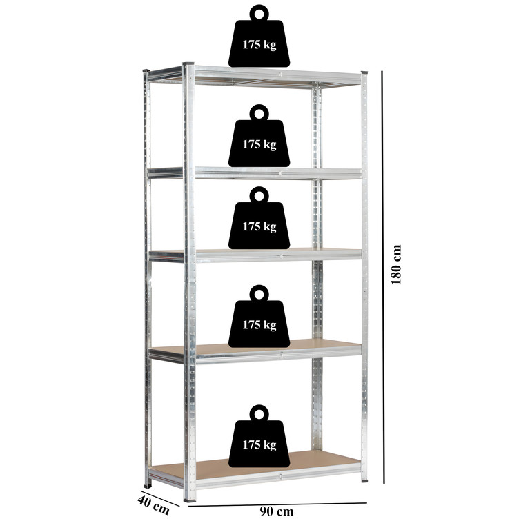 Az állvány 5 polcból áll, amelyekre termékeket, dobozokat vagy eszközöket helyezhet, polconként legfeljebb 175 kg-os maximális terhelhetőséggel.