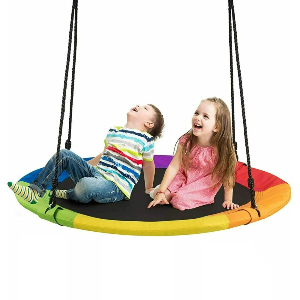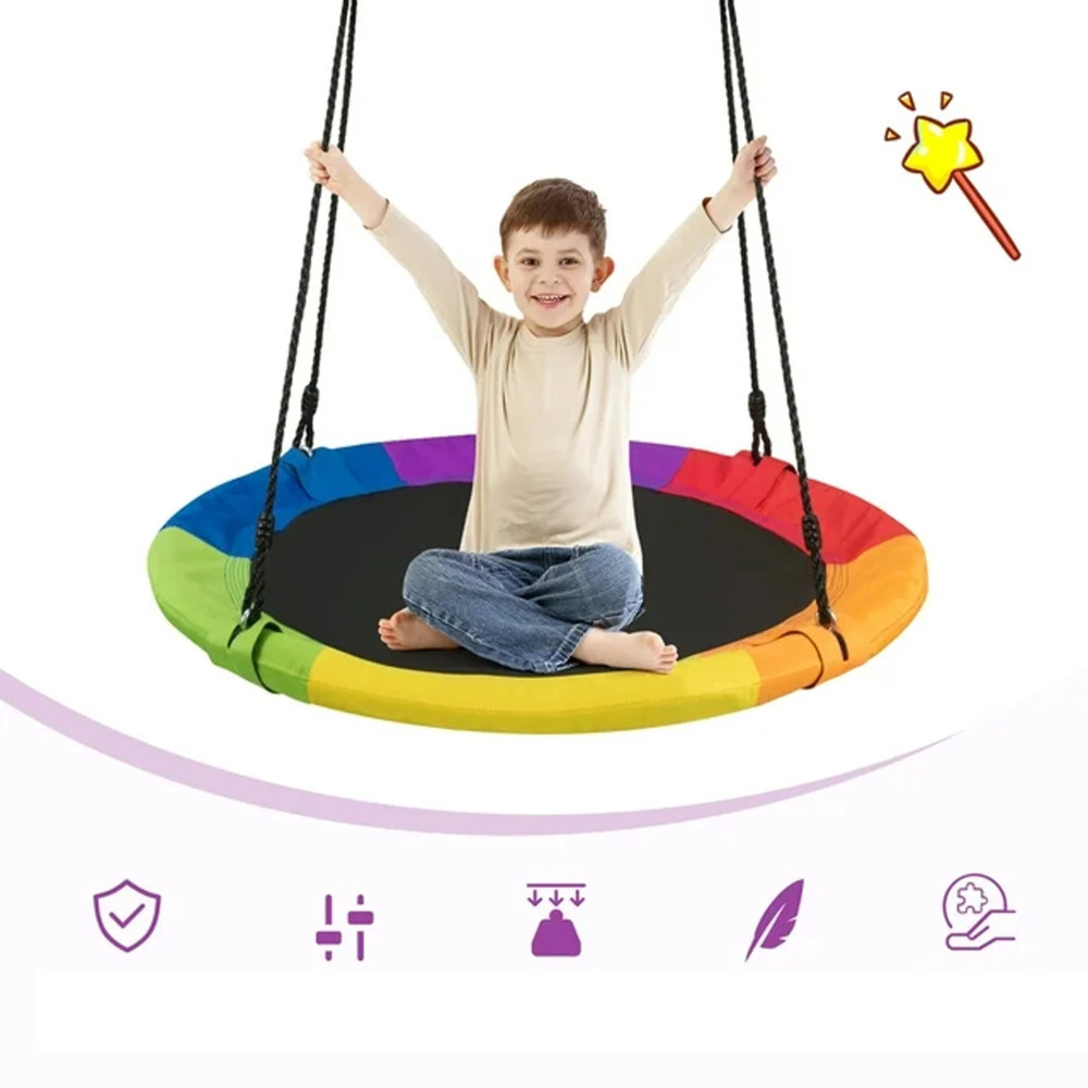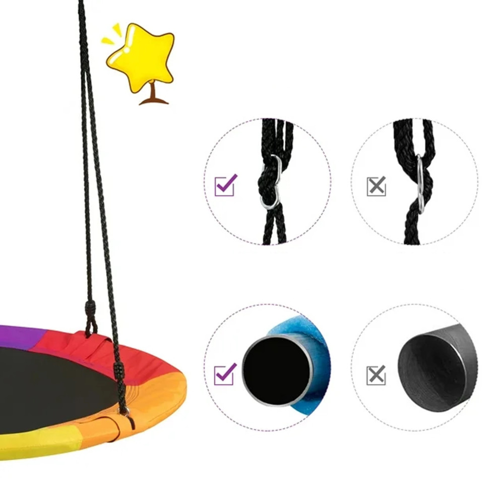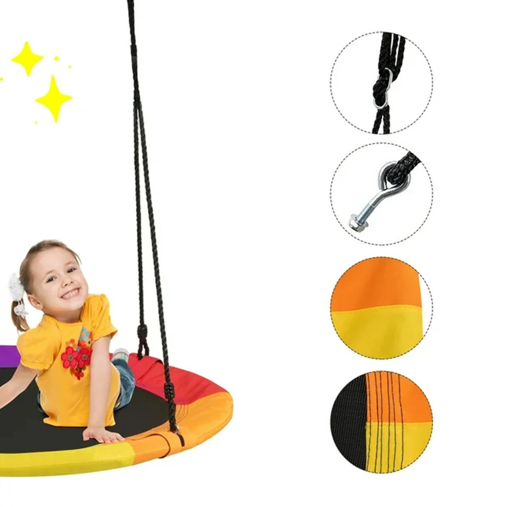 Az ülés átmérője akár 100 cm , ami kényelmes használatot biztosít, és akár több gyerek is játszhat rajta. Az ülés fonott PE kötelekből készült, amelyek jó tapadást biztosítanak. A hinta kiváló minőségű anyagból készült , így a szerkezet ellenáll az időjárás viszontagságainak.