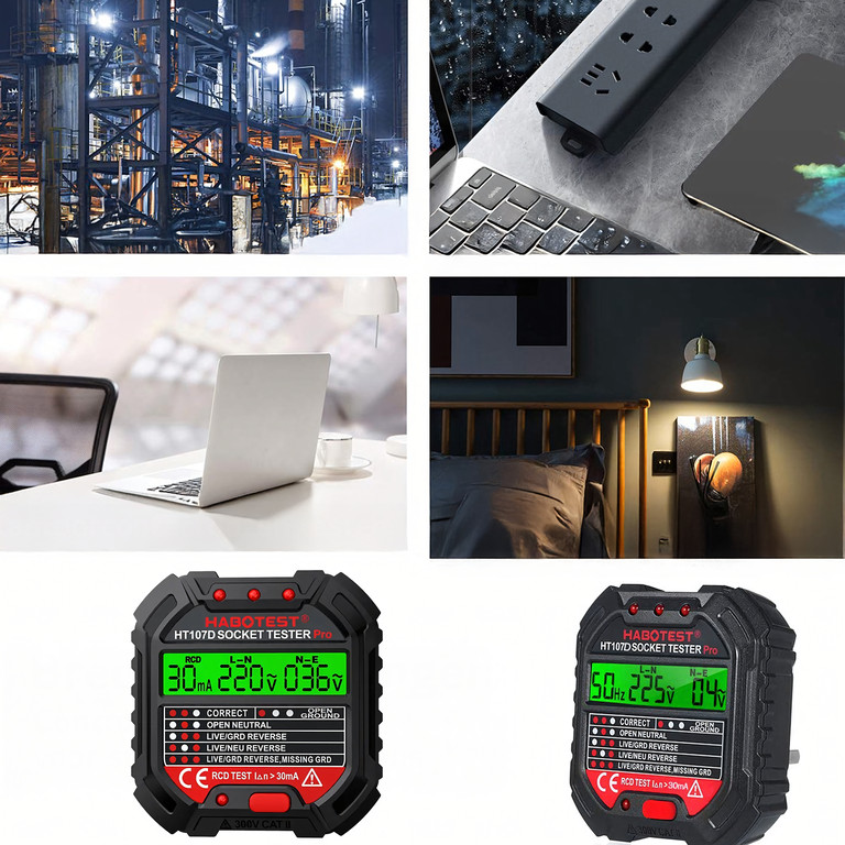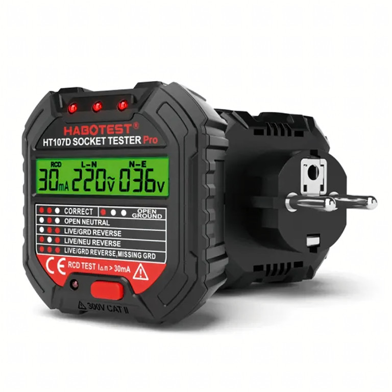 Habotest HT107D aljzatfeszültség-teszter LCD-vel és RCD-teszttel. Biztosítsa otthona, irodája vagy műhelye biztonságát az intelligens Habotest HT107D feszültségteszterrel ! Ez a kicsi, mégis hihetetlenül funkcionális eszköz segít gyorsan észlelni az elektromos telepítés hibáit és elkerülni a költséges meghibásodásokat.