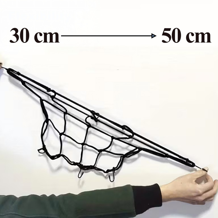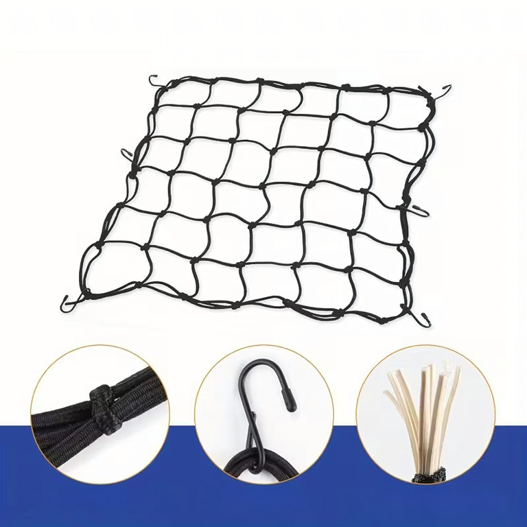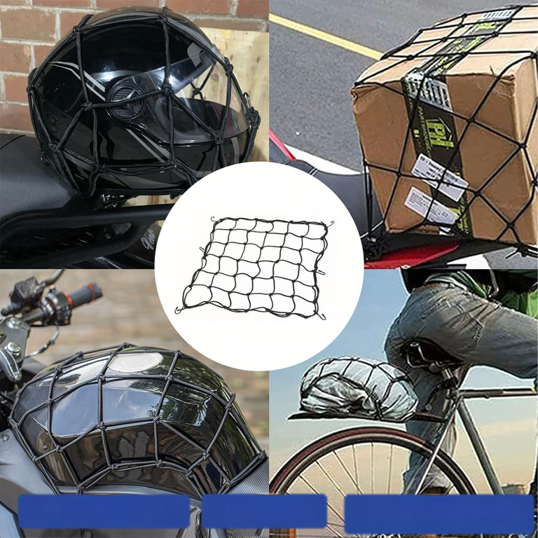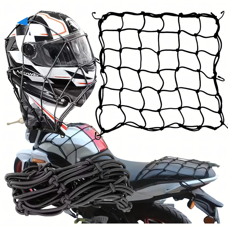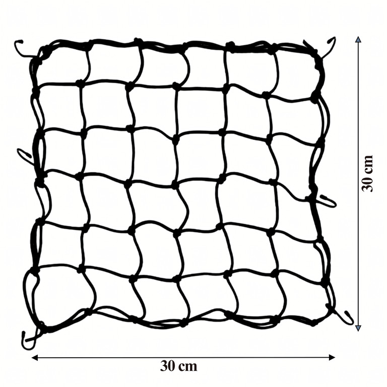 Ez a rugalmas, 30x30 cm-es raktérháló megbízható módja a sisak, élelmiszerek vagy poggyász biztonságos szállításának . Tökéletes motorkerékpárokhoz, ATV-khez, kerékpárokhoz vagy autókhoz , biztonságos rögzítést biztosít a 6 gumibevonatú acélhorognak köszönhetően, amelyek megvédik a felületeket a karcolásoktól.