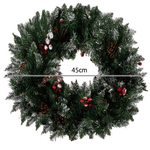 Hófödte karácsonyi műfenyő koszorú 45 cm, műbogyókkal és tobozokkal