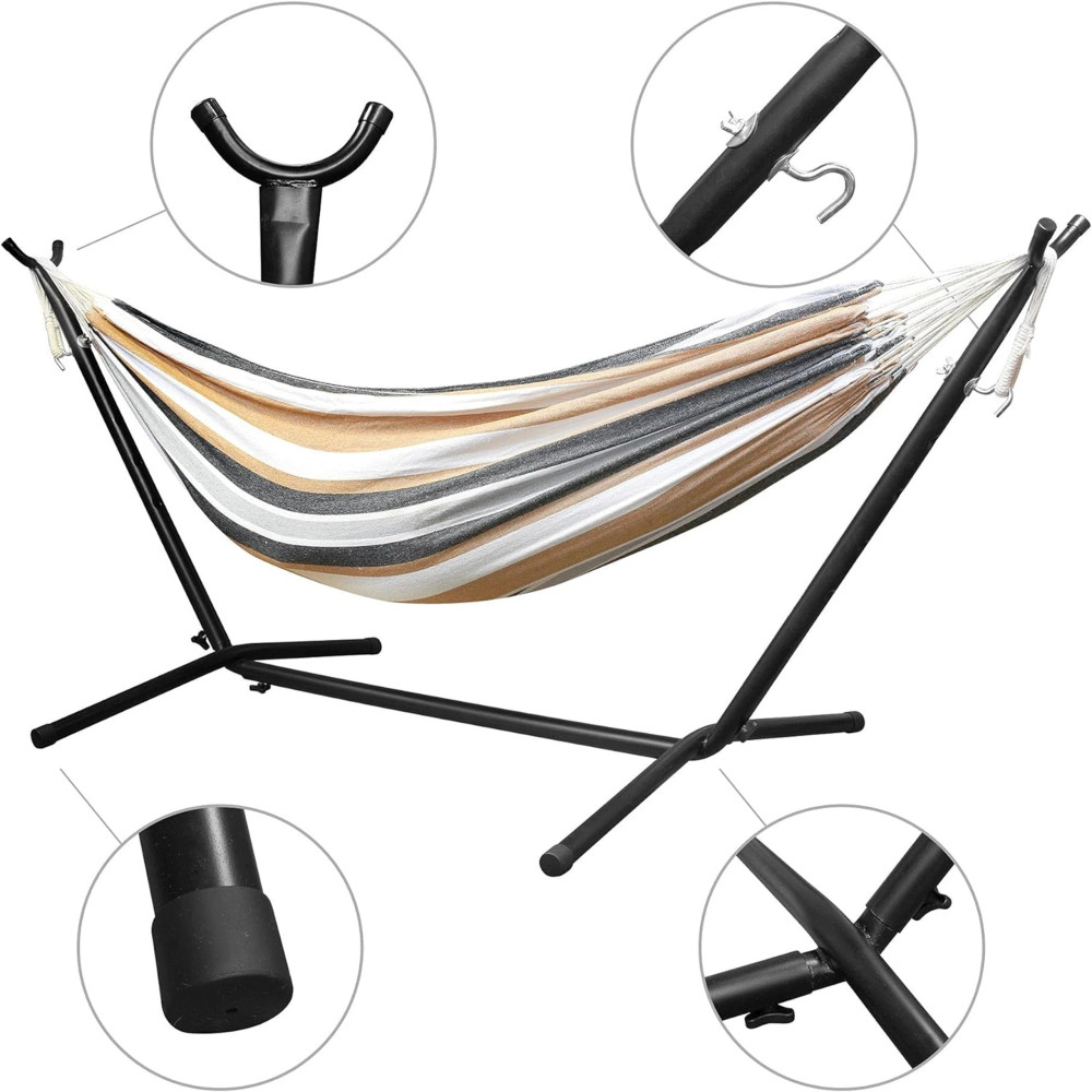 Függőágy készlet, amely pamut függőágyból és kerti keretből áll. A Brazilian rendkívül kényelmes és tökéletesen alkalmazkodik a test formájához . Nagyon strapabíró acélváz, szerszám nélkül szét- és összecsukható. Az egész viszonylag kis méretei lehetővé teszik a kis területek elrendezését. Keret méretei: 265 (hossz) x 100 (szélesség) x 95 cm (magasság) Függőágy méretei: 185 x 80 cm A függőágy maximális terhelhetősége: 150 kg Tartós és stabil Függőágyunk tökéletes választás mindazok számára, akik a béke oázisát keresik saját kertjükben, teraszán vagy akár a nappalijukban. A függőágy kivételes kikapcsolódásra készült a szabadban , így tökéletes a kertbe. Praktikus kialakítása lehetővé teszi, hogy élvezze a béke és a pihenés pillanatait zöldövezetben. Függőágyunk több, mint egy hely, ahol le lehet feküdni – ez egy befektetés az Ön kényelmébe, egészségébe és kikapcsolódásába. Termékünket választva a minőségre, a tartósságra és a dizájnra összpontosít, amely a pihenés igazi oázisává varázsolja kertjét. A FÜGGŐÁGY TÖKÉLETES HELYEKRE, mint például: Kert A függőágy kivételes szabadtéri pihenésre lett kialakítva, így tökéletes a kertbe. Praktikus kialakítása lehetővé teszi, hogy élvezze a béke és a pihenés pillanatait zöldövezetben. Az erkélyen Masszív kidolgozásának és minőségi anyagainak köszönhetően a függőágy az erkélyen is használható, ezzel a megoldással olyan békét és kikapcsolódást teremthetsz, ahol megpihenhetsz egy fárasztó nap után. Kempingezés A kínált függőágy tökéletes megoldás a kempingezés szerelmeseinek. Könnyű anyagának és praktikus kialakításának köszönhetően könnyen telepíthető és mozgatható. Egy szabadtéri tevékenységekkel teli nap után függőágyunk kényelmes helyet biztosít a pihenésre és kikapcsolódásra. A legjobb módja a PIHENÉSRE a kertben vagy az erkélyen Kiváló minőségű, vastag, légáteresztő pamutszövetből készült. Masszív keret Kiváló minőségű, tömör kötélből készült szerelőkötelek. Tökéletes a kertbe, az erdőben az erkélyre vagy a kempingezéshez. Felnőtteknek és gyerekeknek megfelelő méret 265x100cm Rögzítő link és burkolat mellékelve. Maximális terhelhetőség 150 kg-ig! KERTI függőágy XXL KERETTEL + szerelősorok készlete + burkolat Pihenjen luxusban: Függőágyunk a stílus és a kényelem kombinációja, tökéletes a kertbe és a teraszra! A kivitelezés megbízhatósága és a tartósság Olyan terméket kínálunk, amelyet hosszú távú használatra terveztek . A szilárd anyagok, amelyekből a függőágy készült, ellenáll a szélsőséges időjárási viszonyoknak és két ember súlyának , így évekig élvezni fogja. Tartós anyag minden időjáráshoz Az anyag speciális technológiája lehetővé teszi a bőr lélegzését , ami különösen fontos meleg időben, biztosítva a kényelmet a legmelegebb napokon is. Masszív állvány A fekete acél állvány biztosítja a stabilitást és a használat biztonságát. Strapabíró felépítése garantálja a hosszú távú használatot. Könnyű telepítés Felejtsd el a bonyolult utasításokat. A mellékelt szerelőköteleknek és az intuitív utasításoknak köszönhetően gyorsan felszerelheti függőágyunkat, ahol csak akarja. Természetes anyagból A függőágy pamutból és nyomokban poliészterből készült , ami környezetbaráttá és kellemes tapintásúvá teszi az anyagot. Ennek köszönhetően élvezheti a pihenést a friss levegőn, tudva, hogy egy környezetbarát és kényelmes terméket választ , valamint megfelelő szellőzést is biztosít, ami a forró napokon elengedhetetlen. Egy dimenzió, amely lehetővé teszi a szabadságot A függőágyat úgy tervezték, hogy két felhasználó számára biztosítson egyidejűleg teljes mozgásszabadságot és kényelmet. A megfelelő méretek lehetővé teszik, hogy kényelmesen nyújtózkodjon, és megtalálja a tökéletes testhelyzetet két személy számára Vastag és tömör kötél A nejlonból készült tömör köteleknek köszönhetően kényelmesen felakaszthatja a függőágyat, és biztos lehet benne, hogy a kötél megtartja a függőágyat és a pihenő embereket. műszaki paraméterek: KERET: Hossza: ~ 265 cm Szélesség: ~ 100 cm Magasság: ~ 95 cm függőágy: Anyaghossz: 185 cm Anyagszélesség: 80 cm Mit kapsz? 1 x keret összeszerelő készlet 1 x Függőágy