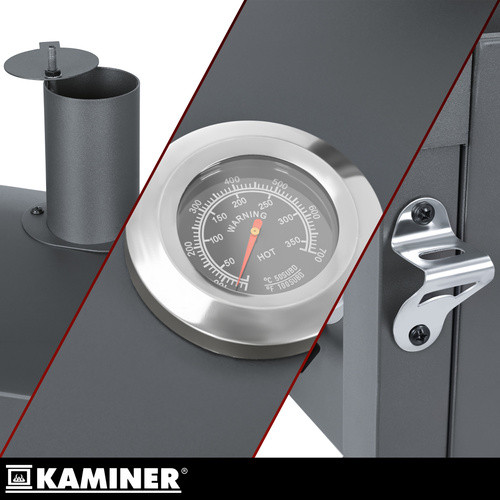 KAMINER kerti faszenes grill fedővel, hőmérővel, 3 részes öntöttvas ráccsal, zománcozott