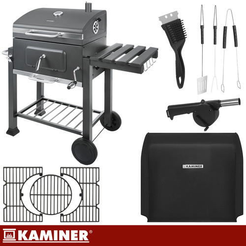 KAMINER kerti faszenes grill fedővel, hőmérővel, 3 részes öntöttvas ráccsal, zománcozott