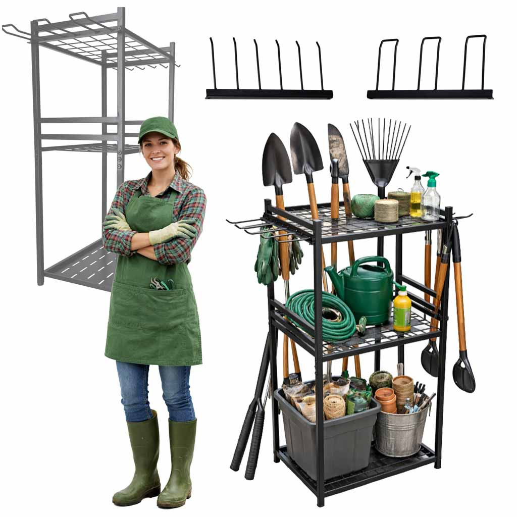 Egy jól szervezett hely jelentősen felgyorsítja a munkát. A kerti szerszámok átgondolt rendszerezése elkerüli a káoszt, és megkönnyíti a szerszámok rendszerezését a munka végeztével. Ez a kerti állvány praktikus kerti akasztóként funkcionál , lehetővé téve a lapátok, gereblyék vagy metszőollók kényelmes tárolását egy helyen. A polcok és fogantyúk funkcionális elrendezése biztosítja, hogy még nagyobb számú szerszám is könnyen elérhető maradjon.