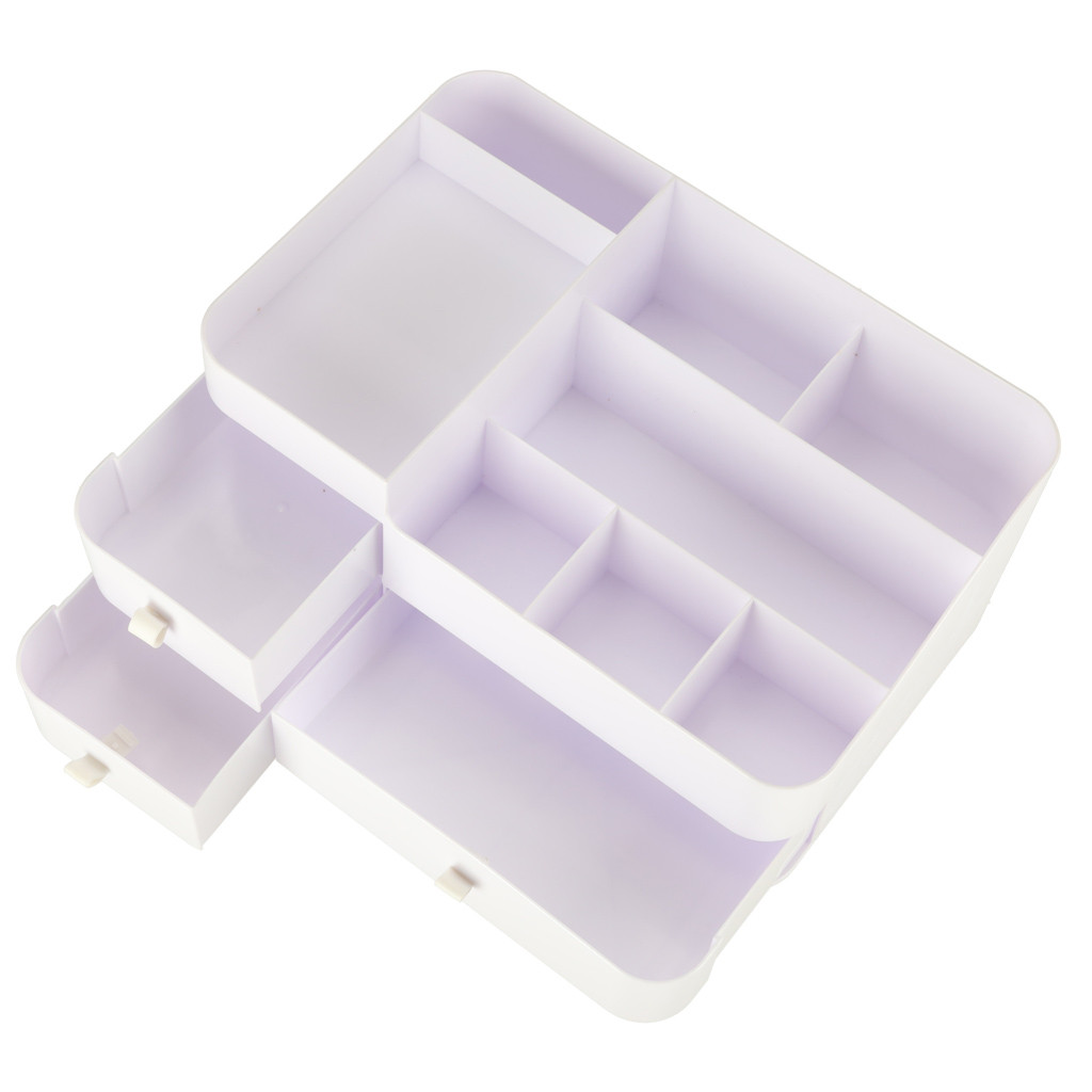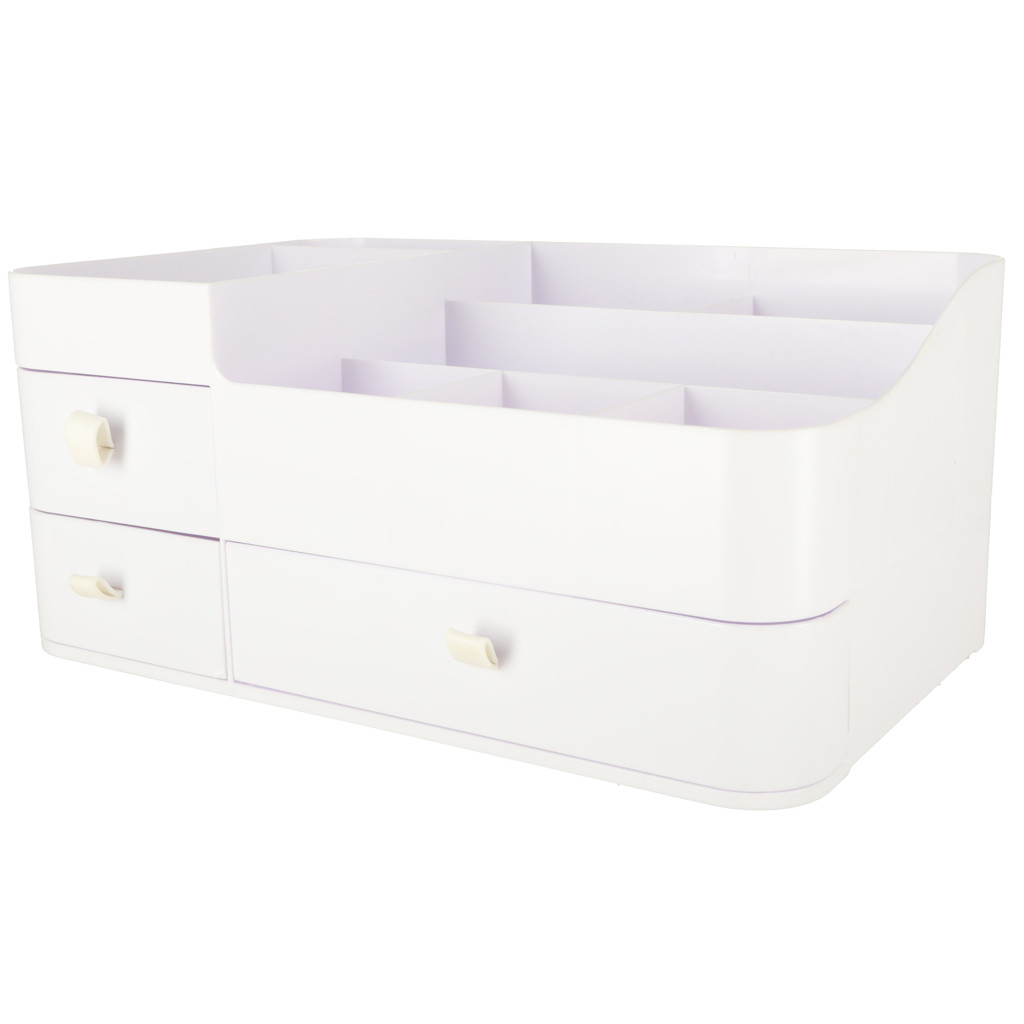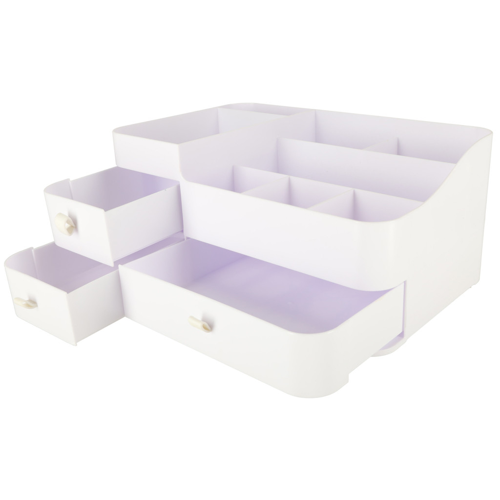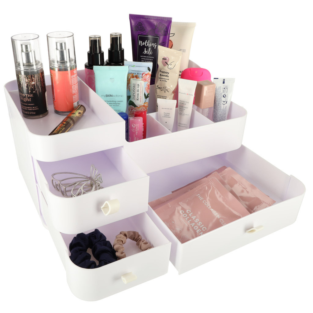 A fehér kozmetikai rendszerezővel könnyedén rendszerezheted a dolgokat. Három kihúzható fiókkal és hét rekesszel rendelkezik a kozmetikumok és egyéb kiegészítők elkülönítéséhez. A fehér szín tökéletesen illeszkedik bármilyen enteriőrbe. Kompakt méretének (34 x 22 x 15 cm) köszönhetően nem foglal sok helyet.