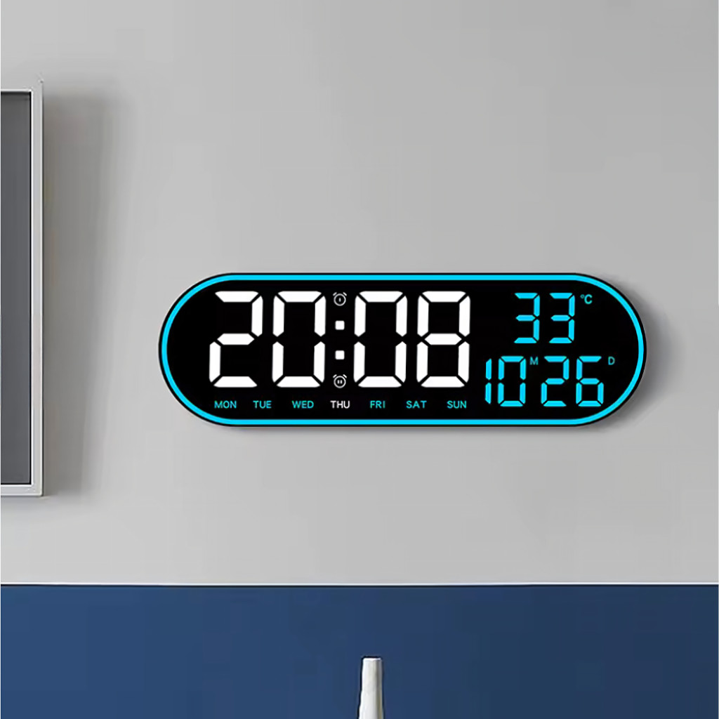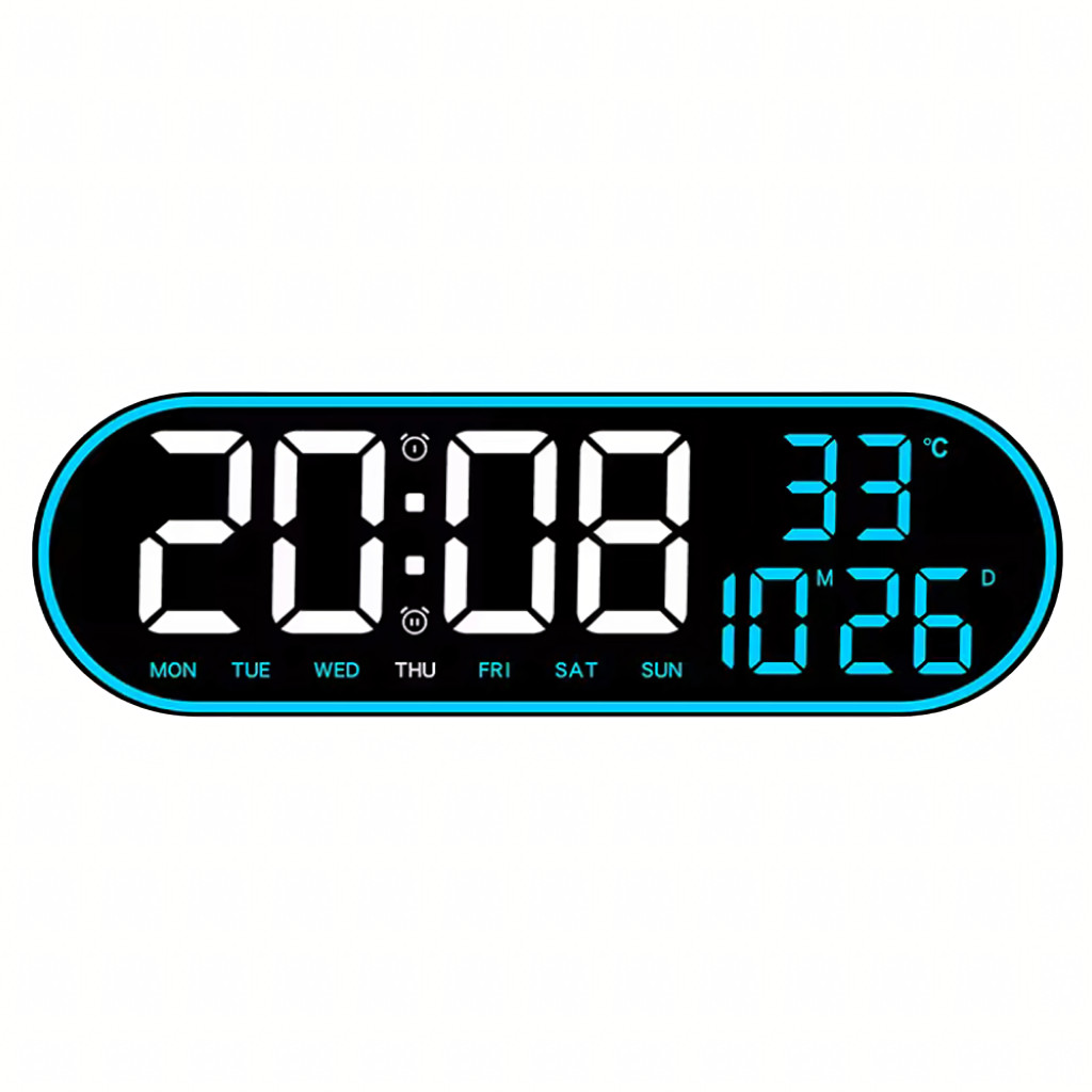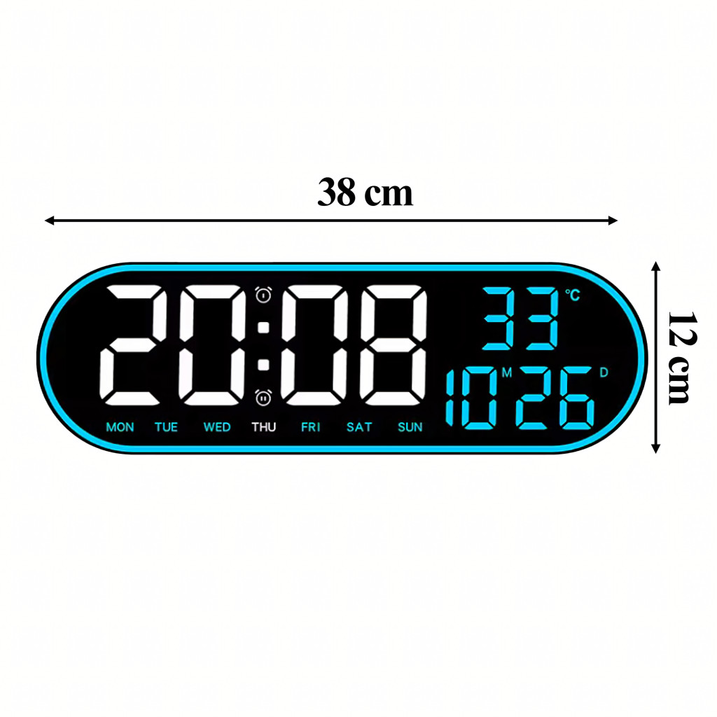 Nagy, ovális, 38 cm-es LED óra távirányítóval, naptárral, hőmérővel, páratartalom-mérővel és kettős ébresztővel