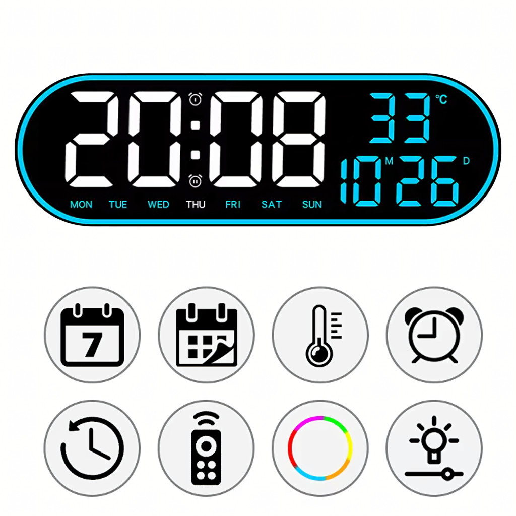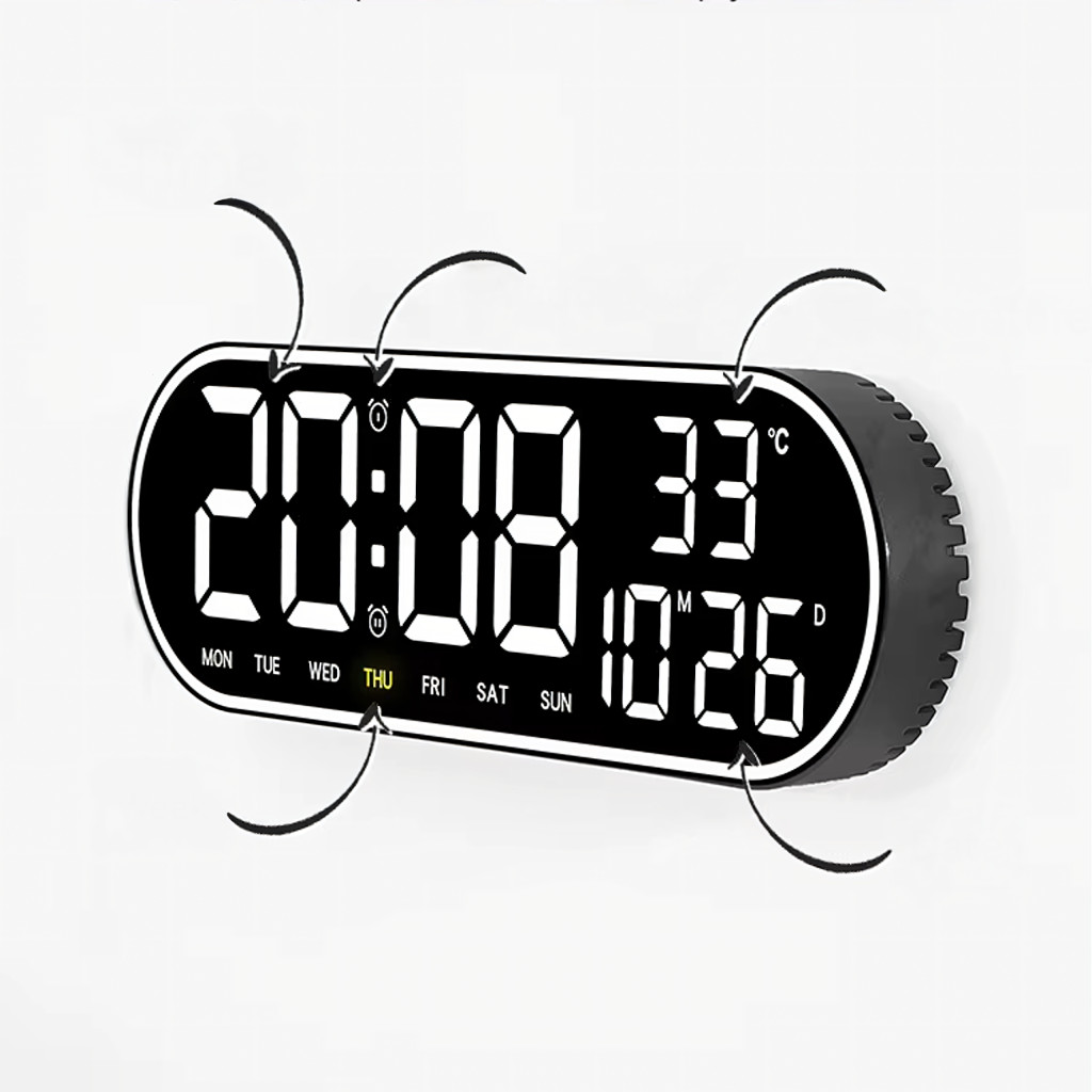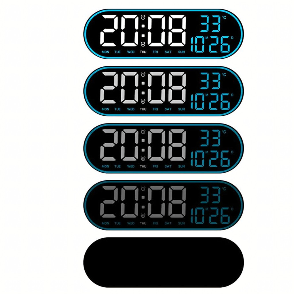 Nagy, ovális, 38 cm-es LED óra távirányítóval, naptárral, hőmérővel, páratartalom-mérővel és kettős ébresztővel