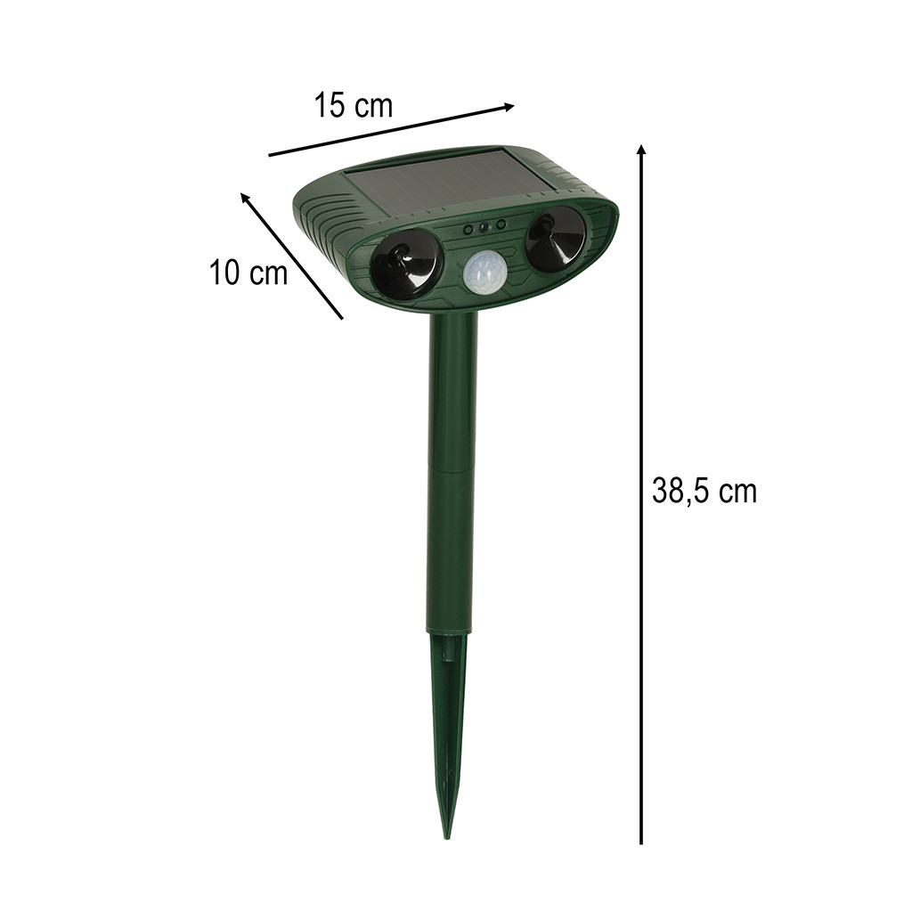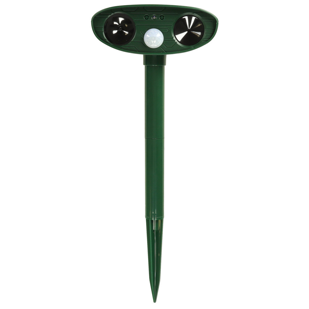 Megbízható állatriasztó kutyák, macskák, madarak, rókák, mókusok és más állatok számára. Az eszköz ultrahanggal működik , hatékonyan riasztja el az állatokat anélkül, hogy károsítaná őket. A készüléket napelem táplálja , és beépített mozgásérzékelővel rendelkezik , így az ultrahangos hang csak akkor aktiválódik, ha állatot észlel. A telepítés a rúd földbe szúrásával történik.