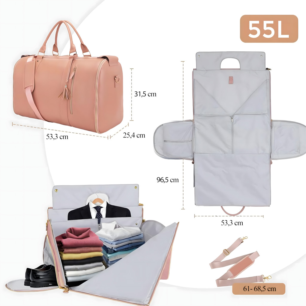 Elegáns 2 az 1-ben utazótáska – akár 55 literes űrtartalommal , beépített öltöny- vagy ruhatáskával . Vízálló, tartós, összecsukható és stílusos – tökéletes üzleti utakra, hétvégi kiruccanásokra és céges összejövetelekre!