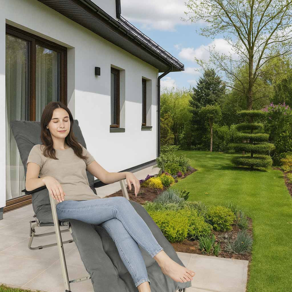 • Állítható háttámla a maximális kényelem érdekében - Állítsa be a szöget az igényei szerint - egy kávézással való üléstől a kényelmes fekvésig napozás vagy délutáni szunyókálás közben.