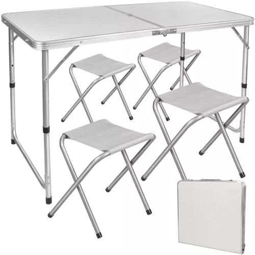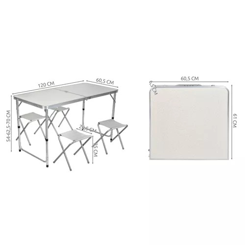 Összecsukható kemping szett, 1 db alumínium asztal 4 db székkel, 120×60,5 cm-es asztallappal