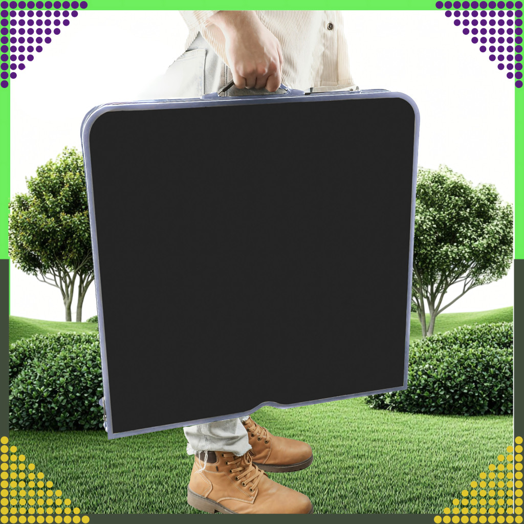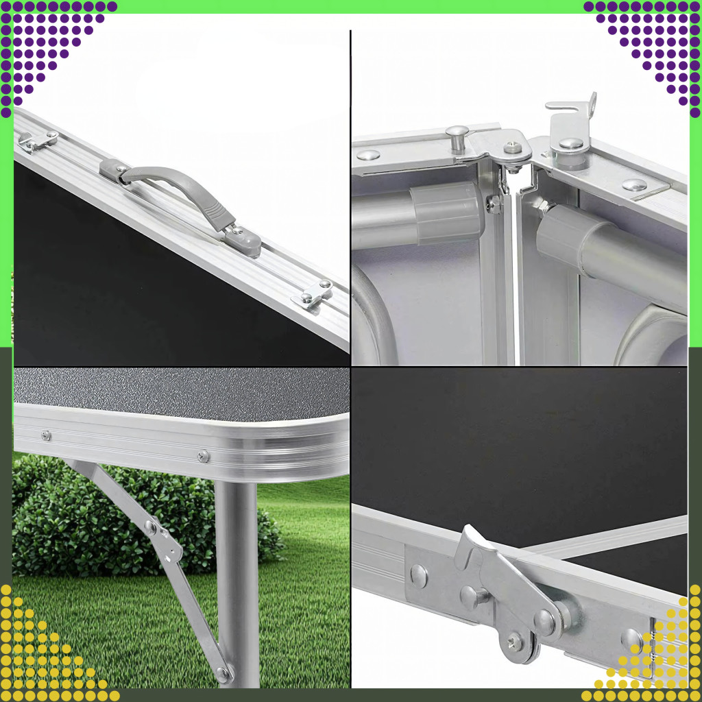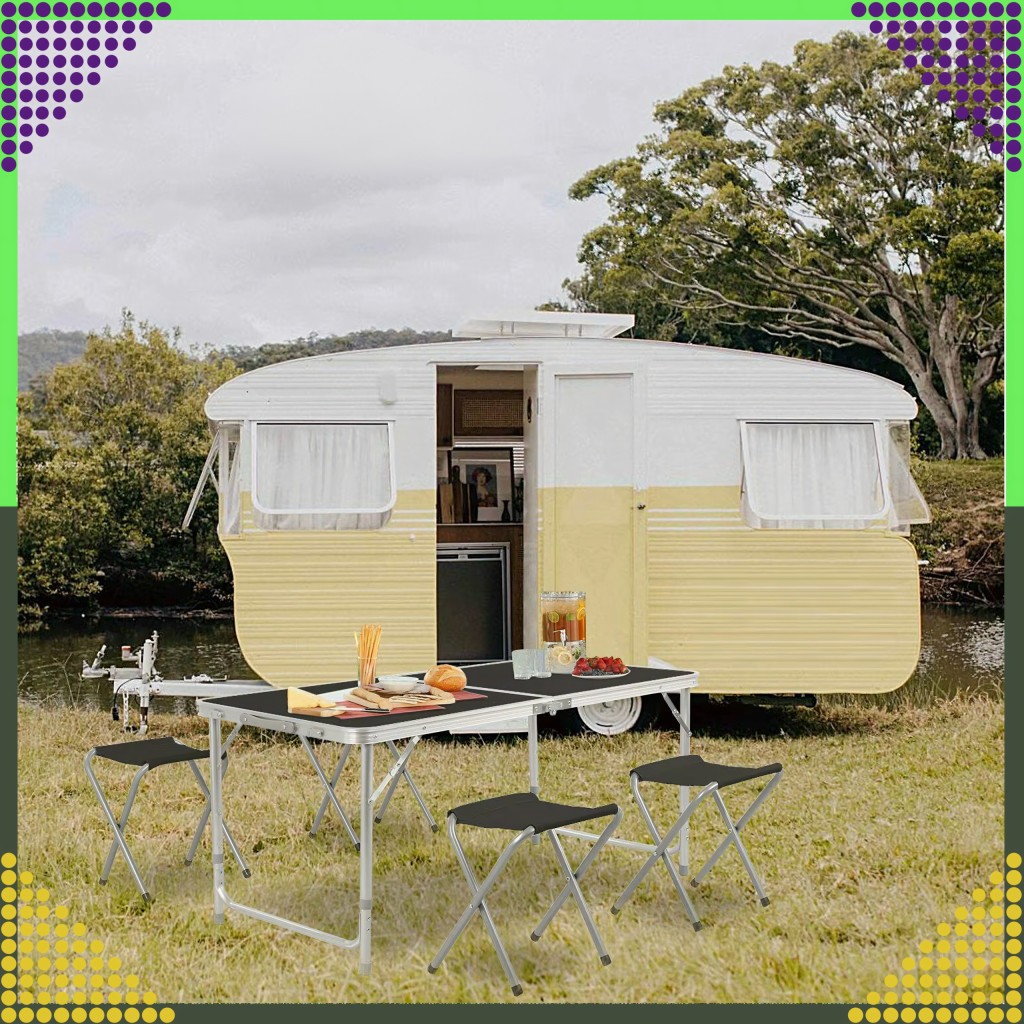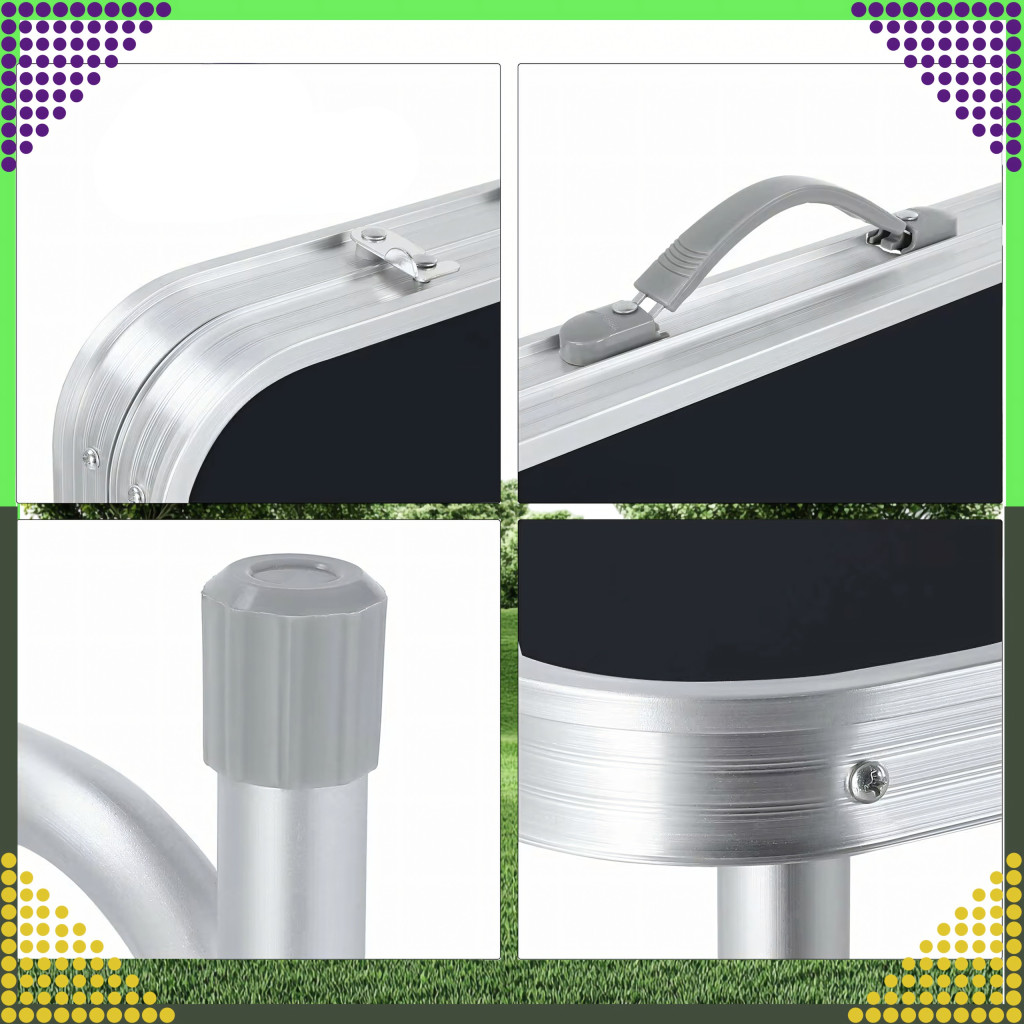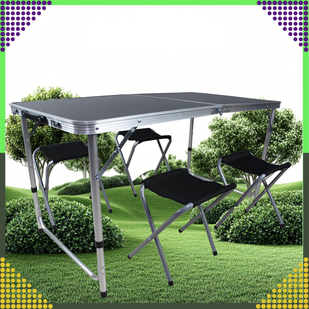 A készlet egy nagy összecsukható asztalból és négy összecsukható székből áll. Az egész egy kompakt, fogantyús bőröndbe összecsukható, így könnyen szállítható és tárolható.