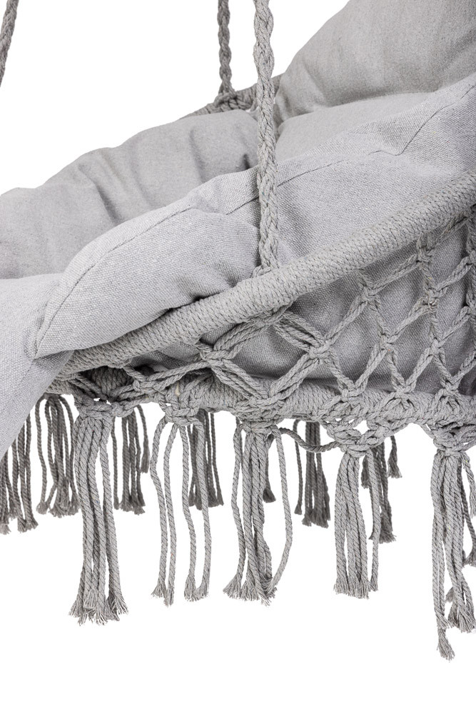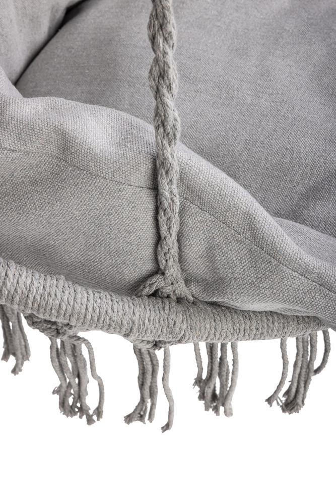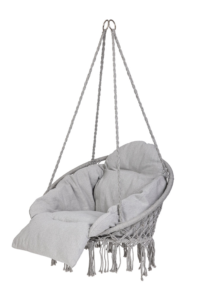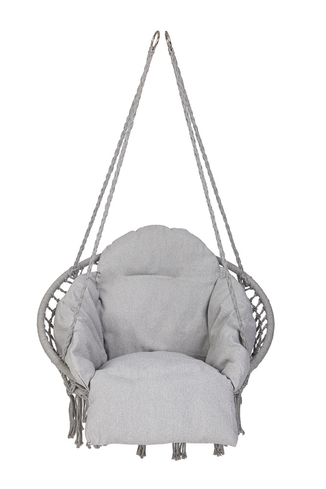 A függőszék XXL méretű párnával garantálja a kényelmet a hátsó udvarban. A tartós kötelek akár 120 kilogrammos terhelést is elbírnak. A puha párnázattal ellátott párna kényelmet biztosít hintázás közben. A szürke szín tökéletesen illeszkedik a kert zöld növényzetéhez vagy a ház belső teréhez. A rögzítőelemek nem tartozékok.