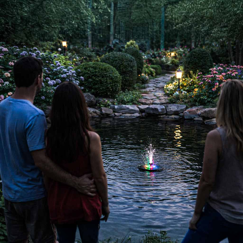 Éjszaka a tava privát pihenőzónává válik , mivel az RGB napelemes szökőkút beépített LED-es háttérvilágítással rendelkezik , amely automatikusan aktiválja az alkonyatérzékelőt. A többszínű RGB LED-ek lenyűgöző fényt vetnek a táncoló cseppekre, így a lebegő napelemes szökőkút minden esti esemény középpontjává válik. A teljes napelemes RGB szökőkútkészlet önállóan működik - a beépített napelemek napközben áramot gyűjtenek, hogy napnyugta után LED-világítást kapcsoljanak be, és elvarázsolják a háztulajdonosokat. Amikor ezt a napelemes szökőkutat választja , a modern dizájnra és a csúcsteljesítményre fogad .