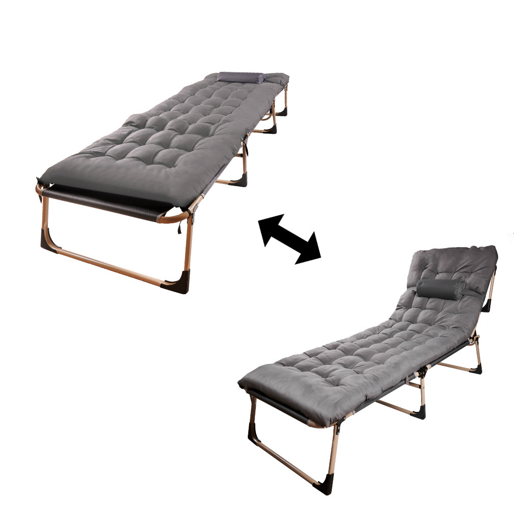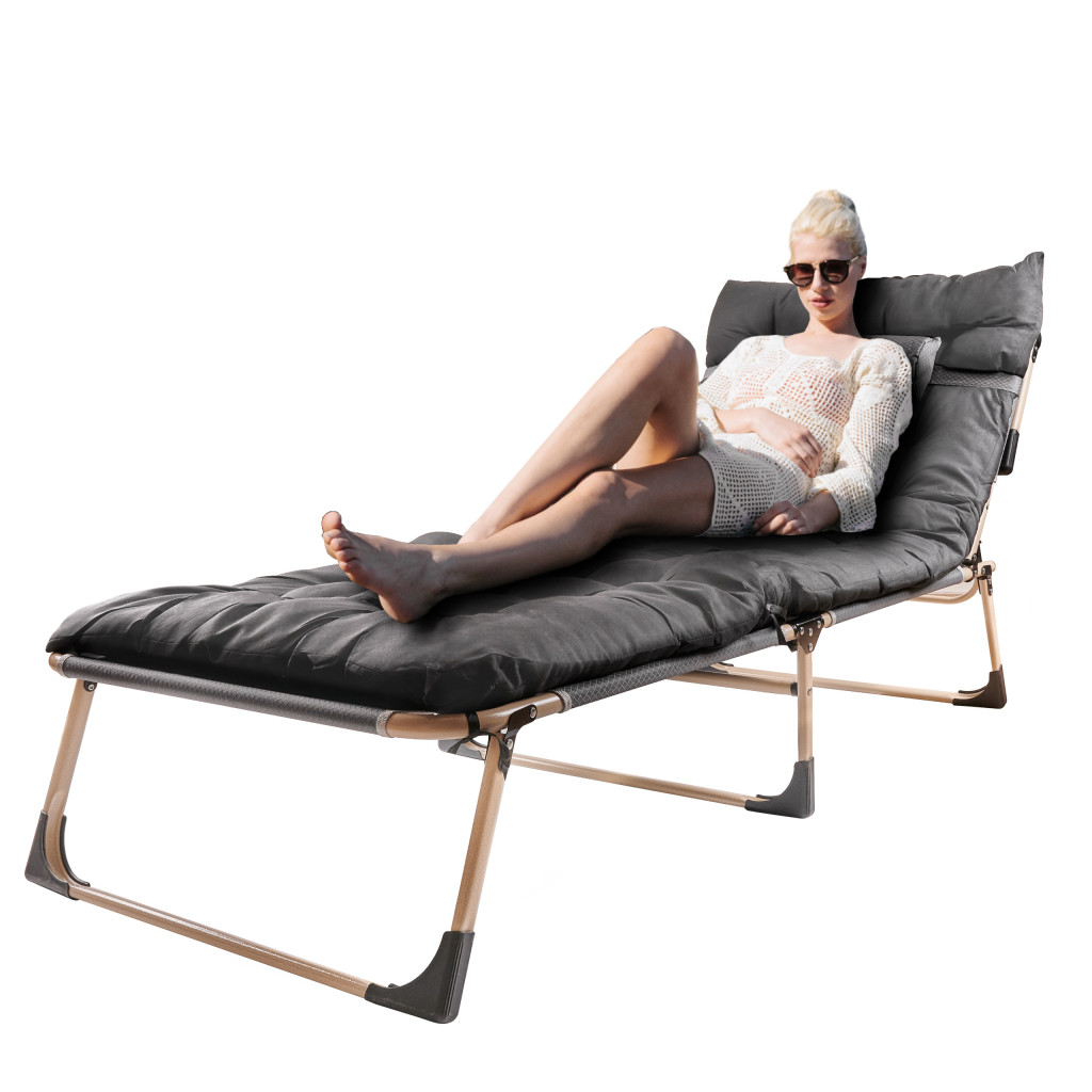 Az összecsukható, párnákkal ellátott szabadtéri ágy ideális módja a kényelmes pihenésnek a szabadban. Tökéletes kempingezéshez, kertben való tartózkodáshoz, valamint extra alvóhelyként szolgál a vendégek számára. Az acélváz biztosítja az ágy stabilitását és szilárdságát, még egyenetlen terepen is. A háttámla négy különböző szögbe állítható, így kényelmesen pihenhet különböző pozíciókban – ülő helyzettől a fekvő helyzetig. Két párna tartozik hozzá – egy nagy az egész ágynak, és egy kisebb a fej alatt. Az ágy kompakt méretűre összecsukható a könnyű szállítás és tárolás érdekében.